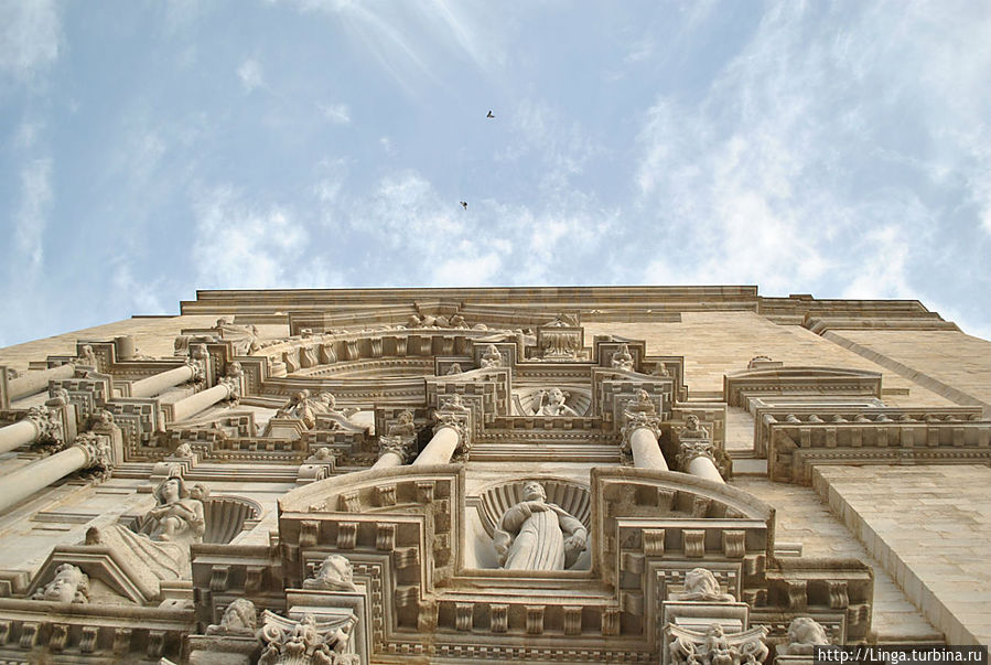 Поражающий воображение фасад в стиле барокко был начат в 1606 году и … не закончен даже в 1730 году. Лишь в 1962 году недостающие статуи заняли свои места в пустующих нишах, их выполнили местные скульпторы Хосе Боигас, Доменек Фита и другие. Верхняя часть Кафедрального собора украшена довольно большим окном, напоминающим окно-розу. Этот образец стиля каталонского барокко выполнен мастером Франциско Саладриги.