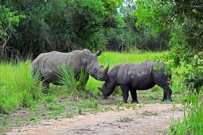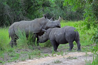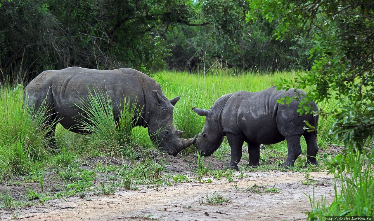 Мы уже примерно час наблюдали белых носорогов в заповеднике Ziwa Rhino Sanctuary в Уганде. Но эти огромные животные все время находились от нас на расстоянии почти сотню метров в густой высокой траве. Мы даже начали хвастать друг друг, когда в кадр попадала большая часть лица носорога, особенно когда с глазами... Но тут вдруг, как будто по какому-то сильному призыву неведомого заклинателя носорогов из нашей группы, из стада выделилась пара — мамаша с девятимесячным сыночком, и бодрой походкой подошли к дороге, с которой нам было дозволено наблюдение.