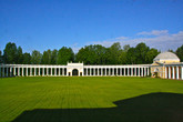 За ней стоит усадьба. Она весьма необычная, так как сделана по форме в виде овала, который образует слитная композиция из колоннады, основного дома и других построек усадьбы. Это око производит впечатление своим масштабом и правильностью классических форм. К сожалению снять это целиком возможно только с вертолета, а будучи там на своих двоих только по кусочкам... Будучи глазом или будучи внутри глаза, непонятно как этот глаз выглядит...
